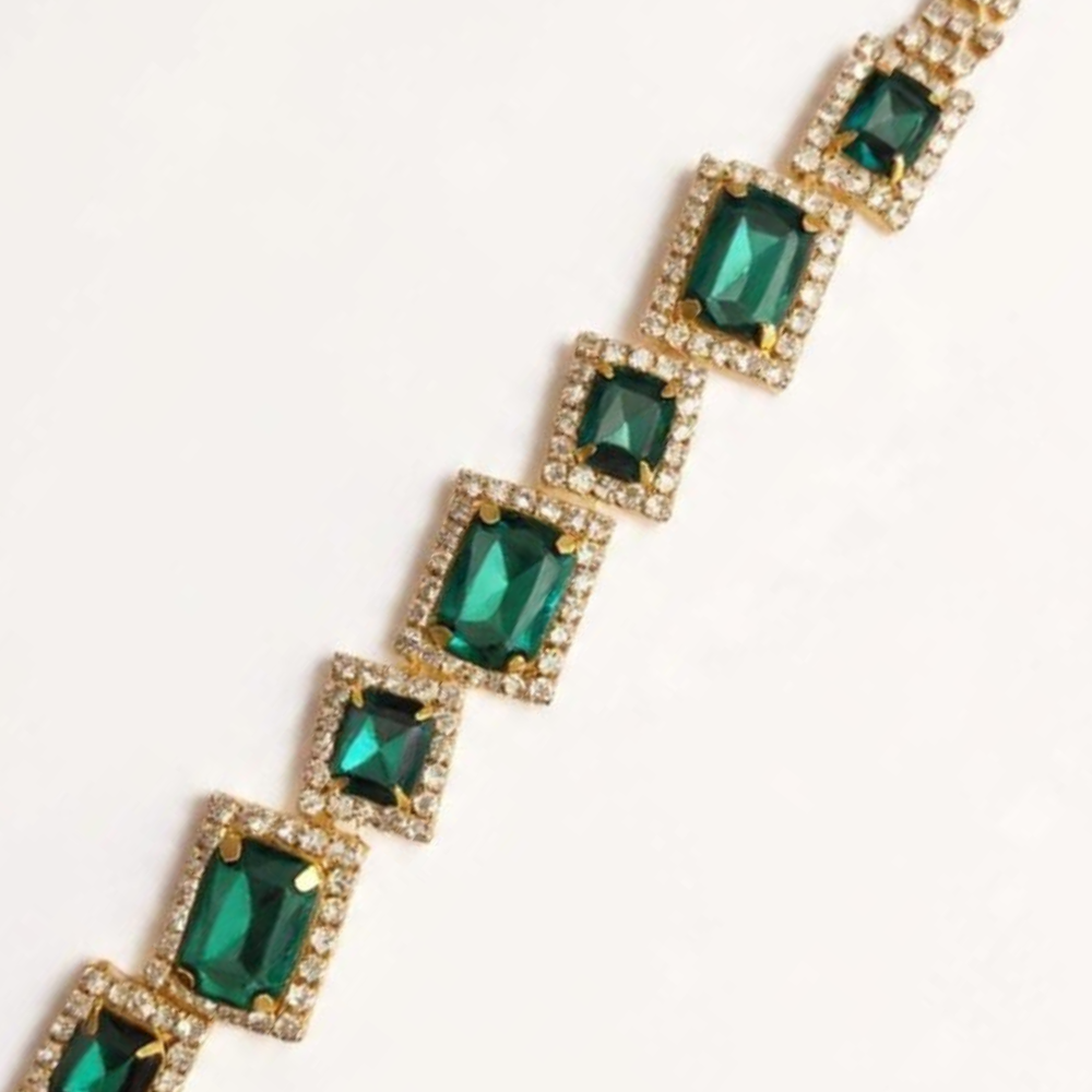 Add a touch of elegance and luxury to your style with the Luxury Green Square Stone Bracelet. Featuring stunning green square-cut stones surrounded by sparkling crystal accents, this bracelet creates a bold and sophisticated look.